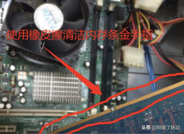 4、我们用手拨开内存条卡槽两端卡扣,然后将内存条拿出来,再用橡皮擦清洁一下内存条表面金手指,清洁干净后重新安装进去或者更换一个内存条卡槽进行安装。