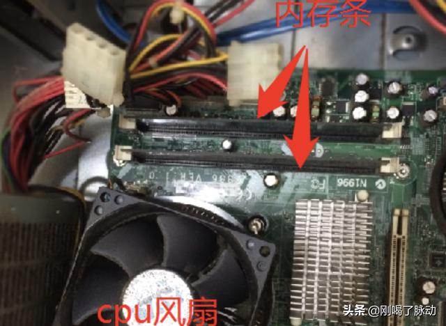 3、拨掉之后我们就可以看到电脑里面所有的东西了,比如主板、硬盘、电源、cpu风扇和内存条等等。(注意:内存条是白色卡超里面,长条形的)