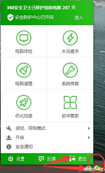 鼠标右键点击“360安全卫士”小图标,然后点击“退出”(如下图)