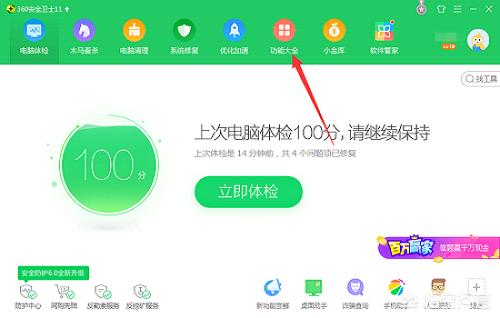 打开“360安全卫士”,点击“功能大全”(如下图)