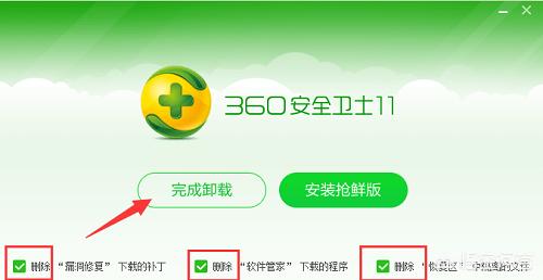 将三个方框打上勾,以免残留垃圾软件。然后点击“完成卸载”:卸载后可进行重启操作,以便彻底删除有些文件。(如下图)
