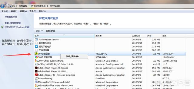 右键点击360安全卫士,然后左键点击【卸载/更改】
