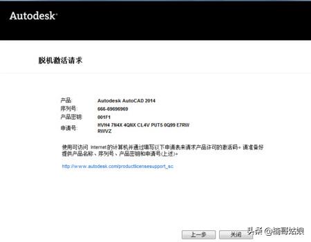 4、点击“下一步”,弹出激活请求界面,利用出现的申请号可以进行激活。