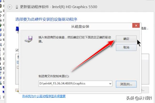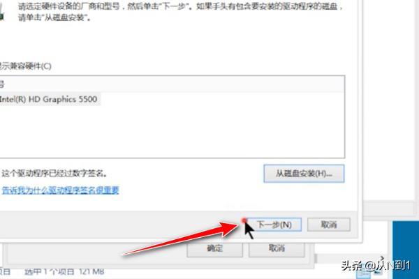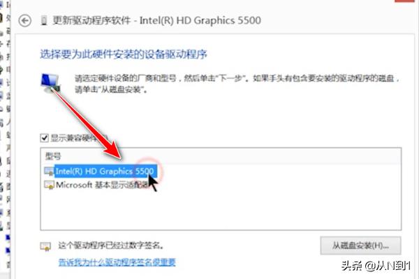 9、找到浏览计算机中查找驱动程序软件,选择从计算机驱动程序列表中选取,选中显卡点击从磁盘安装。