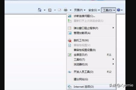 2、然后我们可以点击IE浏览器右上角的“工具”按钮,弹出菜单后选择“Internet”选项。