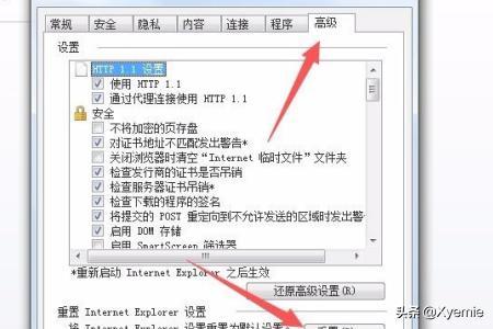 3、在“Internet选项”中会有很多选项卡,选择“高级”,然后点击下面的“重置”按钮。