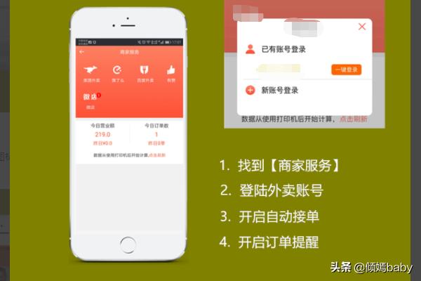 3、自动接单打印外卖平台订单小票设置教程:①找到商家服务②登陆商家账号完成授权③开启自动接单开关④开启订单提醒开关。