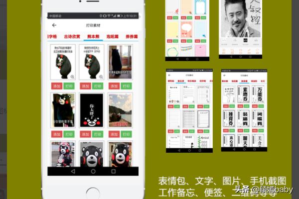 2、打印手机照片/文字/备忘笔记/亲子娱乐/涂鸦简笔画/表情包:1.找到素材库2.添加素材库中的素材直接打印机3.可以搜索一些素材然后保存到手机相册中,然后添加手机图片打印。