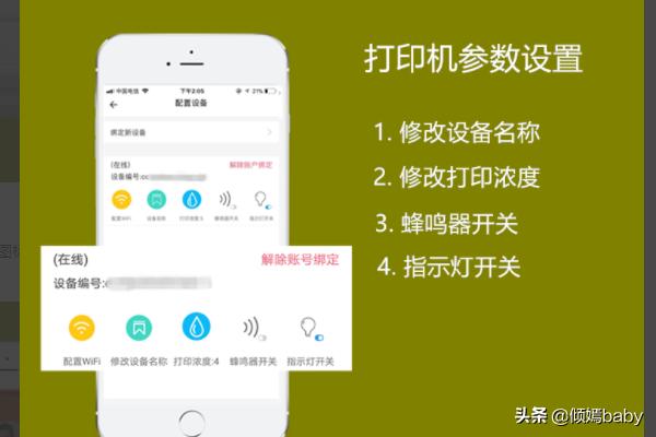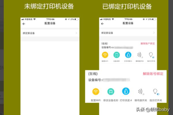 6、成功绑定打印机设备后,在APP中的【配置设备】页面会出现,绑定的打印机设备的设备编码(双击打印机按键获取的小纸条上),以及设置打印机的一些控制按键。
