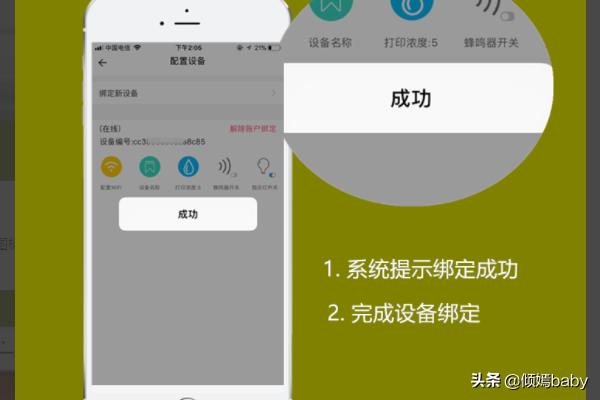 5、系统提示“成功”即代表打印机成功连接手机,其实也就是和APP绑定,这样用户就可以用APP来远程遥控打印机了。