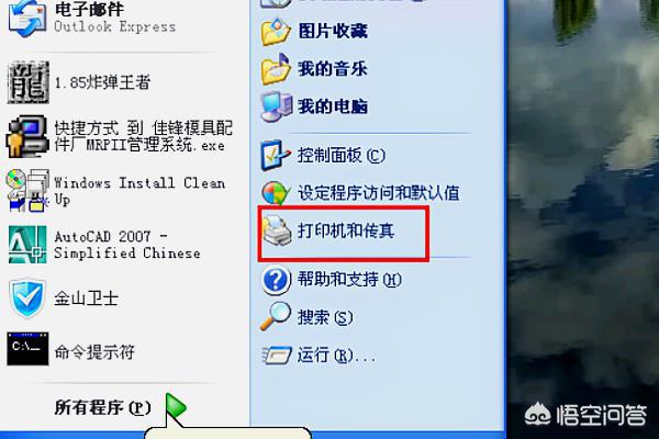 1、点击Winxp系统桌面主菜单,在面板中选择打印机和传真。