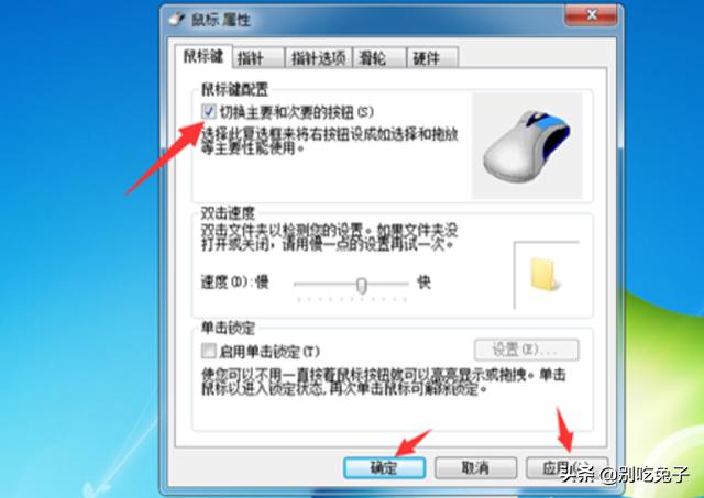 6、然后在里面将鼠标键设置中,切换主要和次要的按键,前面的勾去掉,点击下面的【应用】并【确定】按钮,这样鼠标左键就可以正常使用了