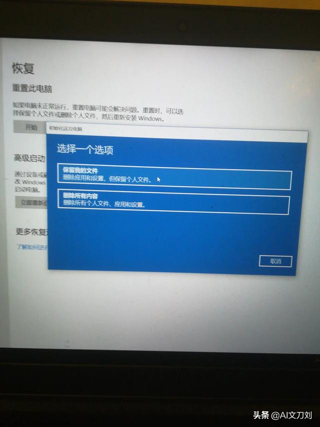 上面那个会保留你的个人文件,点击后开始重置恢复出厂设置,时间花得少;点第二个会彻底删除所有文件记录,时间相对要久很多。注意,恢复出厂设置之前最好把电脑里面的重要资料用移动硬盘拷贝一份。对了,以上两种都需要在电源线接通的情况下才可以操作,防止中途没电造成数据丢失。