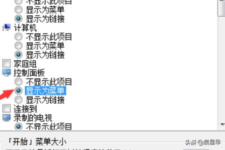 4、然后在打开的窗口中找到控制面板,选择“显示为菜单”选项,完成后,点击确定。