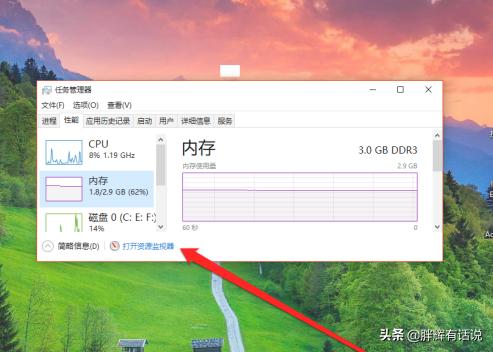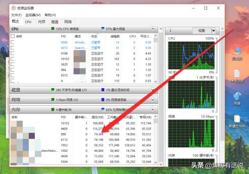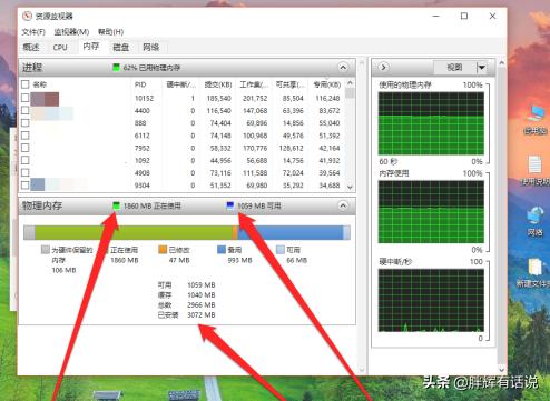 8、从资源监视器的主标题的内存,查看现在内存使用百分之62,并列出了详细的数据。这样我就知道了哪些程序占用内存,占用了多少,内存还剩余多少