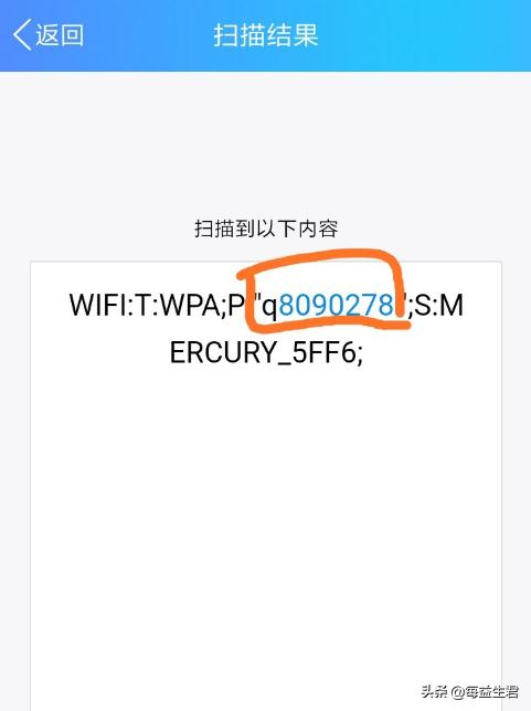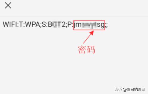 5.扫描完毕,出现一系列字母,字符,数字,这些信息包含着wifi的用户名和密码等其他信息,其中P:后面就是密码jsm****g,不包括后面的两个分号。