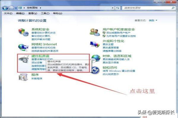 3打开控制面板,我们找到其中的硬件和声音,然后点击进入其中,具体位置如图所示: