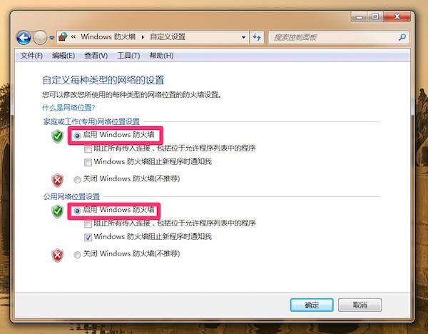 在家庭与公用网络位置中均选中“启用 Windows 防火墙”。