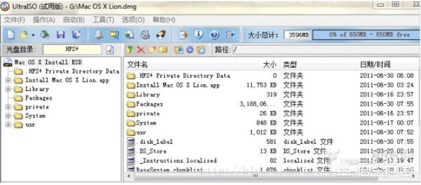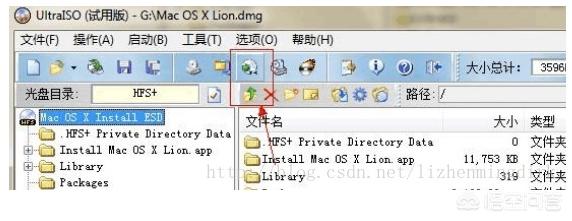 使用下载的工具UltraISO将dmg格式的mac os x文件转换成iso格式的。