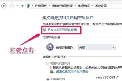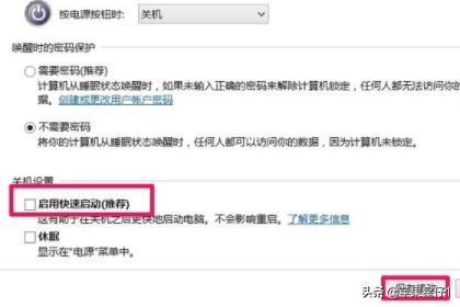 7、设置了能够顺利关机后,我们再开机,在系统设置窗口,左键点击:启用快速启动,在前面小方框内打上勾(不影响关机),再点击保存修改。