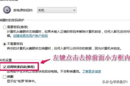 4、下拉右侧滑条,找到关机设置,左键点击:启用快速启动去掉前面小方框内的勾;