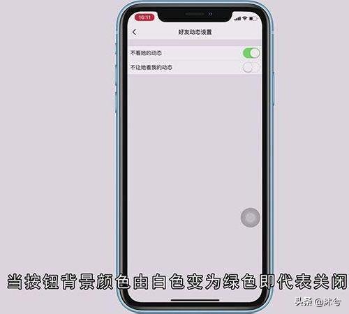 3.当按钮背景颜色由白色变为绿色即代表关闭成功,如果你不想对方看到你的动态消息,你还可以点击【不让她看我的动态】旁边的按钮 ,这样就把qq动态功能关闭了。